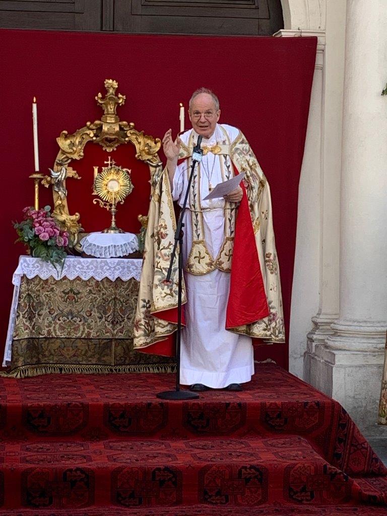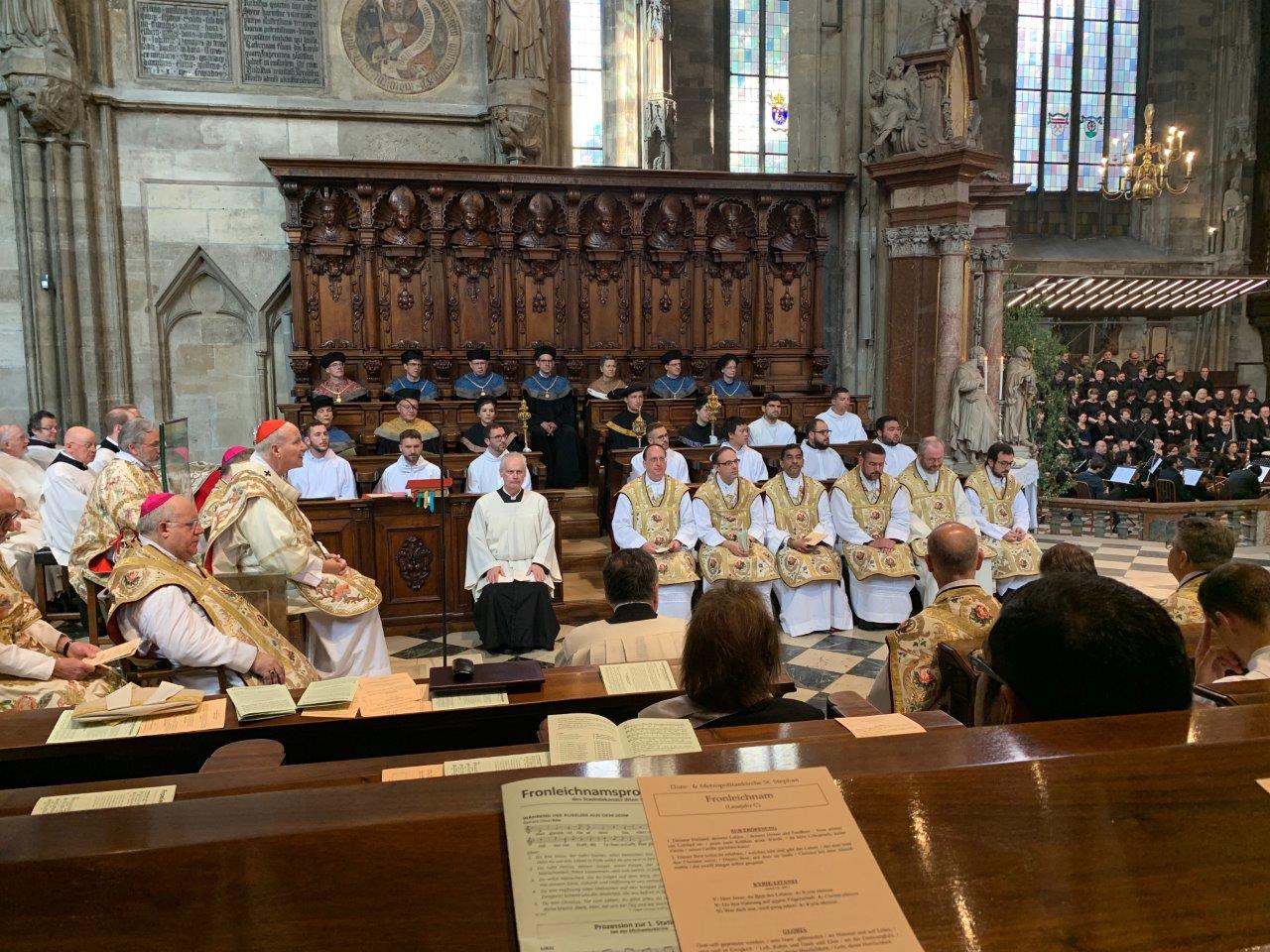 Dort hielt Kardinal Schönborn seine Predigt, in der er auf eine liebende Aufmerksamkeit dem Mitmenschen hinwies. Die überbordende Nutzung digitaler Medien waren ein weiteres Thema. Sie führe zu einer immer größeren Zerstreuung und verhindere den klaren Blick auf die Realität. Er wünsche sich auch einen bevorstehenden Wahlkampf ohne Fouls. Abschließend wies er auf die zentrale Bedeutung der Eucharistie für die Kirche hin und meinte die Gläubigen sollen sich mit liebender Aufmerksamkeit ganz auf Christus in der Eucharistie konzentrieren. Die Prozession führte üben den Kohlenmarkt und Graben zur 2. Station am Petersplatz und von dort zurück zum Stephansdom, wo die dritte und letzte Station gefeiert und mit dem sakramentalen Segen abgeschlossen wurde. Im Anschluss daran kam es auf Einladung des Deutschen Ordens zum traditionellen Zusammentreffen der drei befreundeten Ritterorden unter Teilnahme des Apostolischen Nuntius im Deutschordenshof.